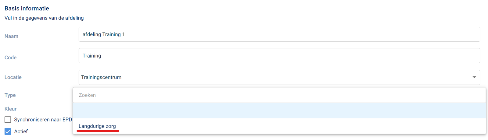 Selecteer bij de basisgegevens van de afdeling het type ‘langdurige zorg’