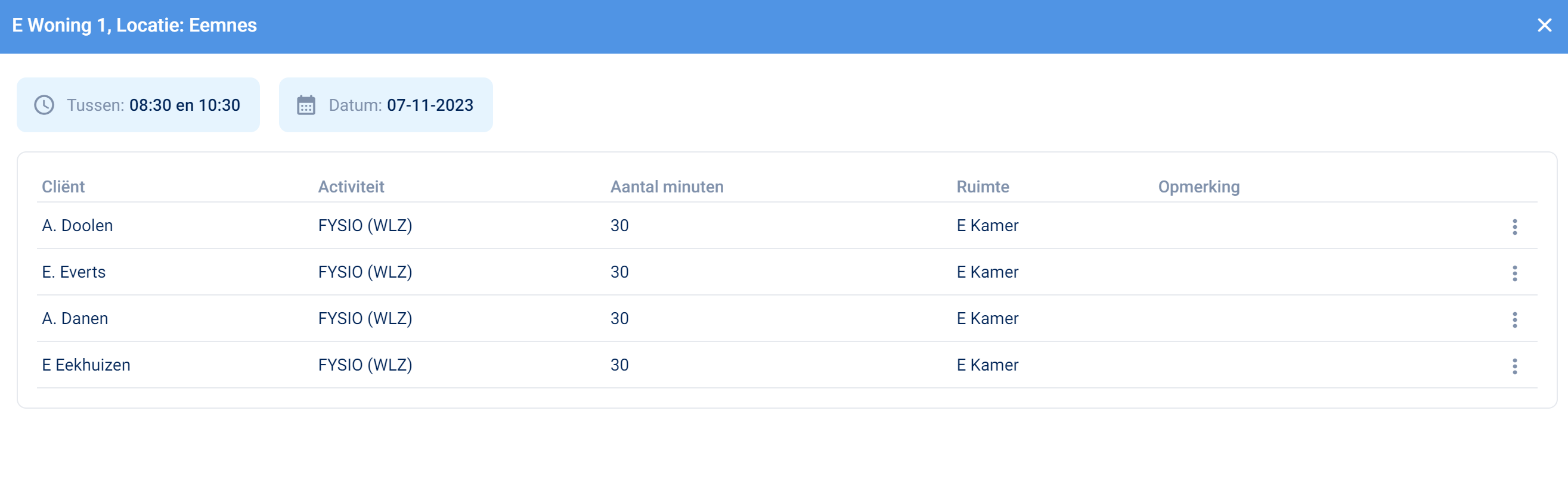 - de namen van de cliënten die behandeld moeten worden in dit tijdsblok